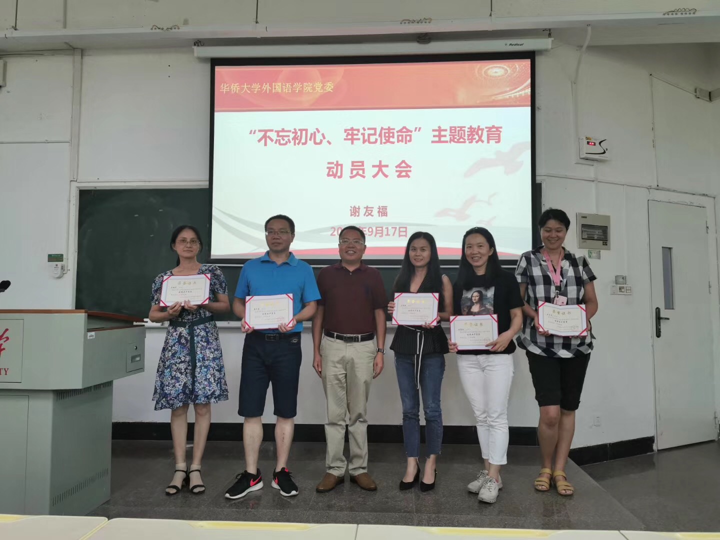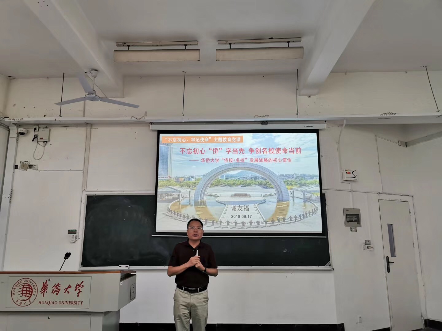 2019年9月17日下午,外国语公司党委书记谢友福在经管1-3阶梯教室,以“不忘初心‘侨’字当先,争创名校使命当前”为题,为公司中心组成员、党委委员、全体教工党员上了“不忘初心、牢记使命”主题教育首场党课。