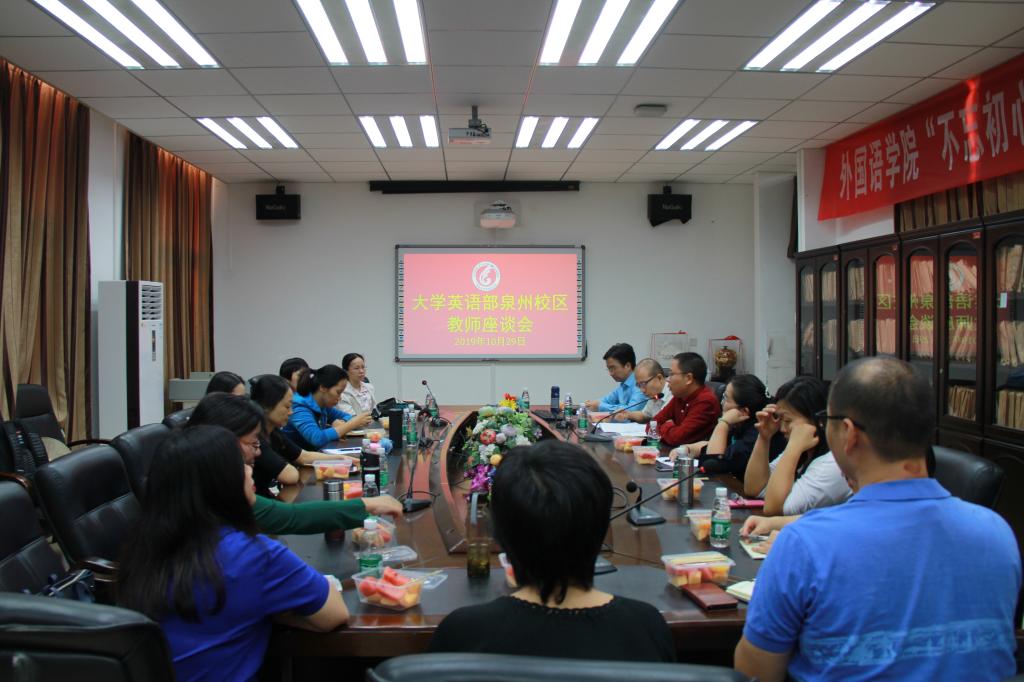2019年10 月29日,球王会于外语楼411会议室召开大学英语教学部教师座谈会。公司党委书记谢友福主持会议,毛浩然经理、杜志卿副经理、大英部教师代表及办公室主任等出席本次座谈会。