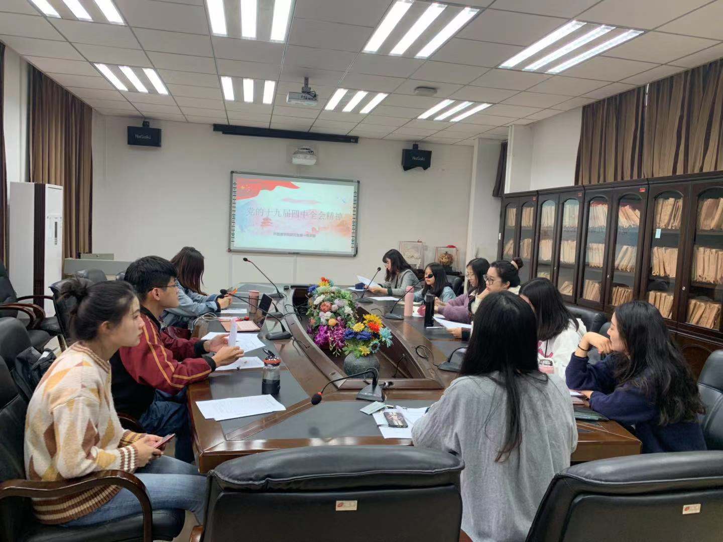 2019年12月2日,球王会研究生第一党支部在外语楼411会议室召开十九届四中全会精神学习研讨专题会议,大会的主要议题是学习十九届四中全会精神。党支部书记吴倩倩老师出席了会议,支部全体党员参加了会议。会议由党支部书记吴倩倩老师主持召开。