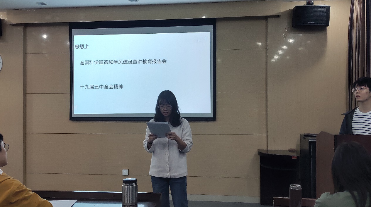 会议伊始,吴倩倩老师就十九届五中全会会议议程,详细剖析了我国发展环境面临的深刻复杂变化。其次,吴倩倩老师结合教育方面对实现“十四五规划”和二〇三五年远景目标进行了解读。她指出,国务院下发的《深化新时代教育评价改革总体方案》要求克服“五唯论”,避免高校教育变得功利和短视。当代高校的研究生应做好专业学习规划,秉持科学精神,踏踏实实做学问,安安静静搞研究,杜绝投机取巧行为。随后,吴倩倩老师强调了“十四五”时期经济社会发展指导思想和必须遵循的原则即“九个坚持”,以及“十四五”期间党和国家将重点发力的12个方面,她真心地勉励在校研究生能够合理利用好公司的学习资源和平台,努力提升自我的科研素养以及综合竞争力。