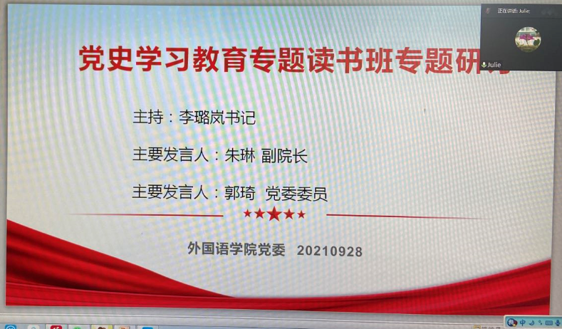 2021年9月28日,外国语公司党委中心组开展党史学习教育专题读书班研讨会,党委理论学习中心组成员、公司党政领导、各系部主任和党支部书记参加了专题研讨,党委书记李璐岚主持。