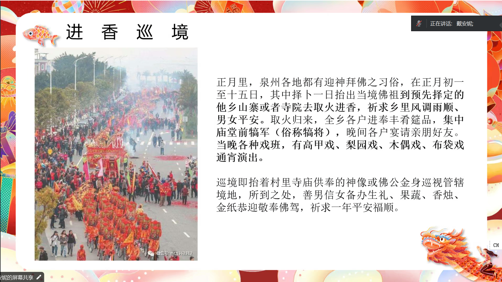 研究生第四党支部于线上展开以“年会不能停”为题的寒假学习交流分享会,旨在加深支部党员对不同地区年俗文化的了解,增加支部成员的文化自信。江门的咸汤圆和鱼灯、长沙的团年饭和花鼓戏、泉州的清水祖师巡游和“踩街”文化、刈香游会、江西赣州的“五股龙”展演和“黄元米果”美食、宁都的三杯鸡…这些传统民俗既是年味的载体、文化的结晶,也是“烟火气”里迎新春的象征。作为新时代的老员工,我们应该发扬这些优秀的传统文化,让年味越来越浓!