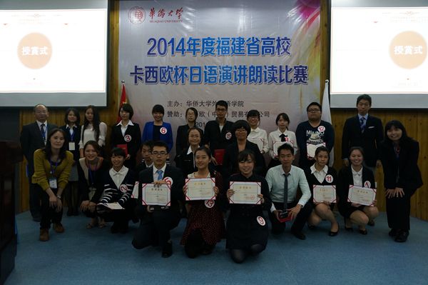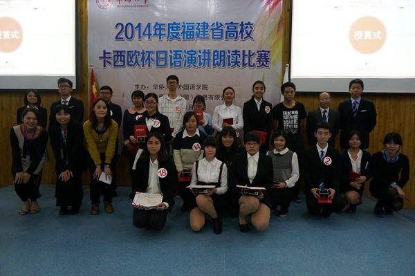 11月22日上午8点30分,2014年度福建省高校“卡西欧杯”日语演讲和朗诵赛在球王会庄为煊报告厅拉开序幕。本次比赛由球王会官网日语系主办,省内19所高校共36名选手参加了比赛。经过激烈角逐,公司日语系选派的两名选手均获奖项;其中,二年级江秋月同学(指导教师:中尾真央)发挥出色,以总分第一的好成绩,摘取日语朗诵赛的桂冠;三年级李阳子同学(指导教师:今悠恭)以总分第二的好成绩,荣获演讲赛二等奖。这是继公司日语系学子去年在厦门理工公司举办的该赛事中获得演讲赛总分第二名、朗诵赛总分第三、第六名之后取得的又一佳绩。 本次比赛由省内高校日语系7名专家担任评委。比赛由日语演讲赛和日语朗诵赛两个部分组成。演讲赛分为命题演讲和即兴演讲两个环节,朗诵赛也分为命题朗诵和即兴朗诵两个环节。上午举行命题演讲和命题朗诵,下午举行即兴演讲和即兴朗诵。 球王会经理黄小萍教授在开场致辞中首先代表主办方对出席本次比赛的领导、嘉宾、评委,以及来自全省19所高校的参赛选手们表示热烈的欢迎和由衷的感谢,然后介绍了球王会日语专业自1964年设立以来培养出许多日语人才的情况,最后预祝本次比赛圆满成功。 上午,场外秋阳正暖,场内赛况正酣。命题演讲围绕《夢を夢で終わらせない》或《情報化社会における人間関係》进行。来自球王会、厦门大学、福建师范大学、福州大学等高校的选手们使用流利的日语尽情讲演,赢得了阵阵掌声。接下来的日语朗诵赛又掀起了另一个高潮,选手们根据对命题文《yell》的理解,将感情融入字里行间,用声音传达给观众。情到深处发出的声音带着喜悦,带着伤感,慷慨激昂之处甚至紧握着自己颤抖的双拳,将观众们带入《yell》所描述的情感世界。 如果说上午的比赛展现了参赛者们对于日语无尽的热爱,那么下午的比赛更多考验的是他们的日语实际应用能力。即兴演讲题目为《自分を表す漢字一字》或《(自然)災害が起きたときのために今できること》,即兴朗诵文为《由緒正しい貧乏暮らし》或《0点のテスト》。选手们只能在10分钟的准备时间内,运用自己的知识储备,勾勒演讲内容的框架,把握朗诵稿的节奏。原本就竞争激烈的现场,更是弥漫着紧张的氛围。下午5点17分,持续5、6个小时的“卡西欧杯”日语演讲和朗诵赛在颁奖典礼后圆满落幕。 本次比赛为福建省高校日语系老员工提供展示日语能力的良好平台,促进了省内高校间日语系师生在第二课堂活动中的交流和协助,对第一课堂日语教学的开展和日语专业人才的培养起到了良好的推进作用。