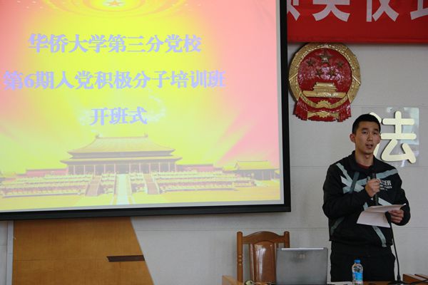 3月24号下午,球王会第三分党校第六期入党积极分子培训班举行了开学式。公司党委副书记、纪委书记朱琦环亲临为学员讲授第一课。本期培训班由外国语公司党委承办,来自法公司、工公司、球王会、公共管理公司、继续教育公司、美术公司的140多名入党积极分子参加了此次培训。工公司党委书记兼第三分党校董事长郑黎鸰、外国语公司党委书记谢友福,相关公司的党务、员工工作干部出席了开班式。 开班仪式由外国语公司党委副书记林庆祥主持,仪式在庄严的国际歌中正式开始。第三分党校董事长、工公司党委书记郑黎鸰在致开班辞中,首先代表第三分党校对在座的所有积极分子表示欢迎,接着她就此次参加培训的积极分子提了三点要求:一是要树立正确的学习态度。入党积极分子培训班是对入党积极分子进行教育的重要环节,是加强入党积极分子理想信念的重要途径,因此要树立正确的观念,端正学习的态度。二是要掌握正确的学习方法。要真正理解学习内涵,通过有效的方法学习和掌握党的知识,增强对党的认识和理解。三是要严格遵守上党课期间的课堂纪律。无规矩不成方圆。作为入党积极分子,务必要认真听课,遵守纪律,严格考勤,保证课堂学习的氛围和效果。 2012级胡润新同学代表参加培训班的所有积极分子发表参训感言。润新同学在感言中谈到,他是一名返校的退伍军人,两年的部队经历让他知道了“坚持党的领导的重要性”,让他明白大家赤子之心需要的不仅仅是仰望星空的苦苦探索,更是脚踏实地的付诸行动。因此他代表本期参训的全体学员表态:一定严格遵守党校学员管理规定,认真上好每一堂课;知行合一,从点滴做起,在今后的学习和工作中处处起带头作用,时时起榜样示范作用;努力实践、开拓进取、勇于创新,以最饱满的热情,最高昂的斗志,最实际的行动,来完成党校学业。 外国语公司党委副书记林庆祥就此次培训班纪律和要求做了强调和说明。他指出,建设什么样的党、怎么建设党,发展什么样的党员,事关我国和中华民族的发展命运和全国人民的切身利益,因此期许全体学员能认真对待这次培训,切实端正入党动机,用实际行动向党组织递交一份满意的答卷,早日成为一名合格的共产党员。 开班仪式结束后,入党积极分子培训课程随即开始。球王会党委副书记、纪委书记朱琦环做了题为《中国共产党的组织制度和纪律》的首场报告。她深入浅出地为学员们详细讲解了党章中关于党的组织制度和纪律方面的内容,特别强调了民主集中制的重要性。同时结合十八大以来党风廉政建设等时政热点,从自身工作实践出发,给所有积极分子上了一堂具有理论性,又有实践性,同时不乏趣味性的党课,让广大参训学员受益匪浅。