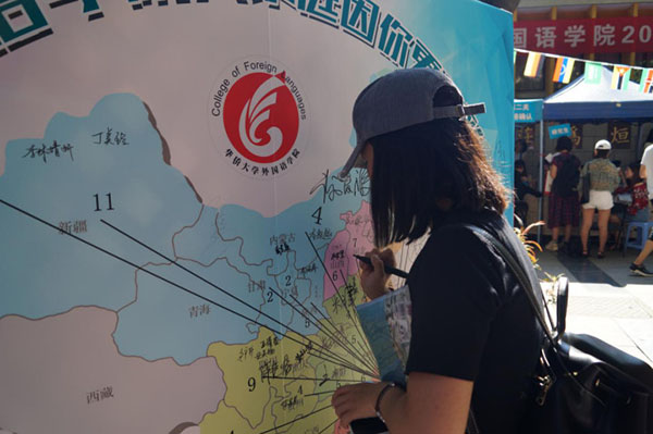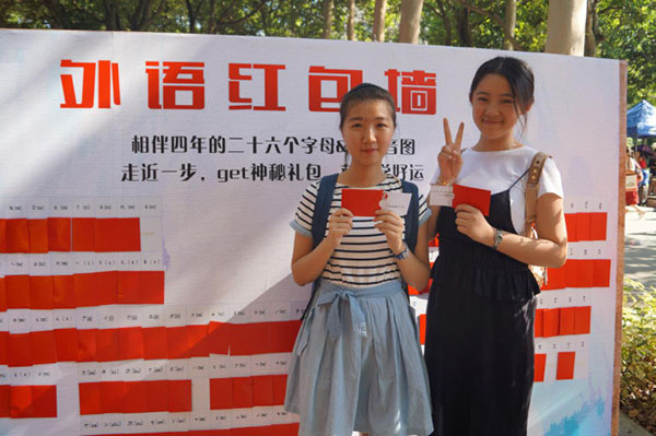走进外院迎新现场,由日语五十音图和英语二十六字母组成的红包墙吸引了大批新生参与。红包内放有用英语和日语撰写的人生格言卡片、公司领导新学期寄语以及抵用券等,让新生在获得小惊喜的同时感受公司的温暖。以中国地图为背景的签名墙新颖别致,新生纷纷在签名墙上签下自己的名字,象征着正式加入外院这一温暖大家庭。此外,迎新现场还悬挂着万国旗,独具异国风情,彰显外院特色。鼓声正浓,外院的中琉太鼓队鼓点铿锵,太鼓源于日本,被外院学子倾情演绎,独具感染力,吸引了众多家长驻足观赏,成为了华园大道上别具一格的靓丽景致。