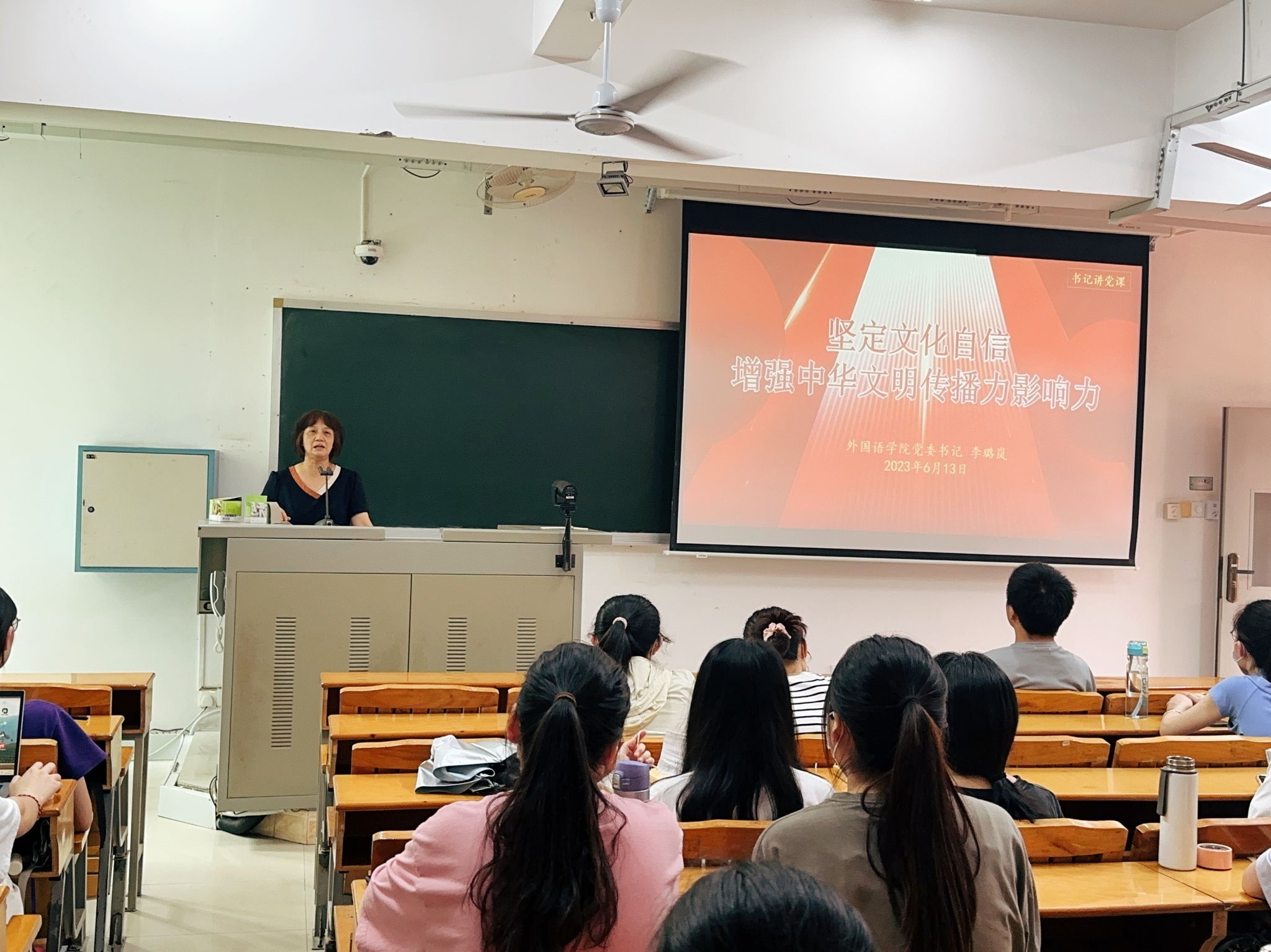 党的二十大报告中作出“推进文化自信自强,铸就社会主义文化新辉煌”的重大部署,提出“增强中华文明传播力影响力”的任务要求。2023年6月13日,外国语公司党委书记李璐岚在公司祖杭楼205教室作《增强文化自信——增强中华文明传播力影响力》的专题报告,结合公司专业特色,为公司预备党员与党员同志上了一堂生动的党课。