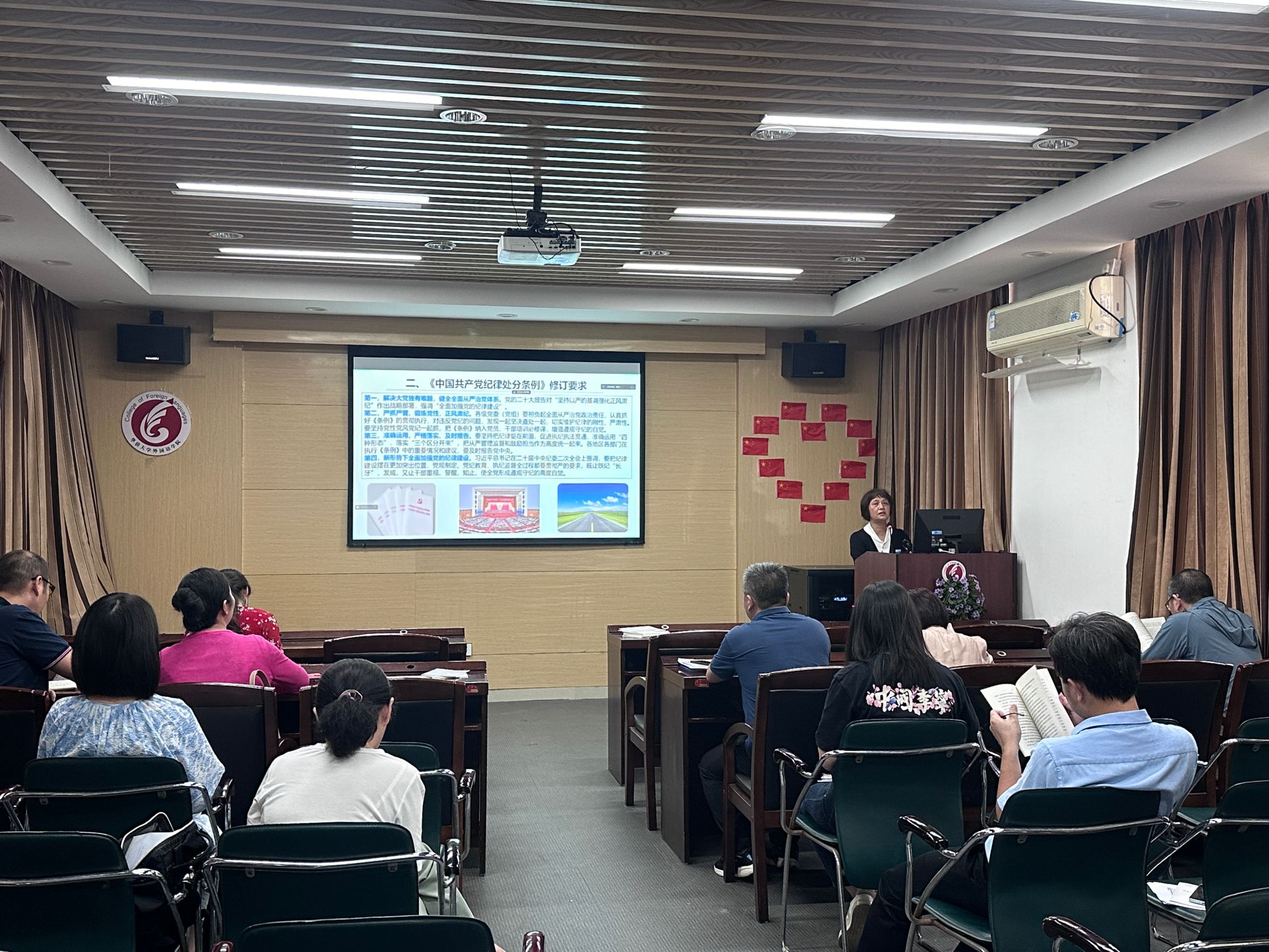 为深入学习新修订的《中国共产党纪律处分条例》,准确把握其精神实质,不断增强教师党员的政治意识、纪律意识、规矩意识,5月7日,外国语公司党委书记李璐岚同志以《新修订< 中国共产党纪律处分条例>解读》为题讲专题党课,公司全体教师党员两校区视频会议参加学习,并分发每人一本学习教材。